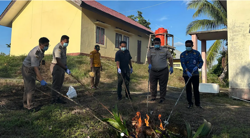 Kegiatan pemusnahan berlangsung di halaman kantor Karantina PLBN Badau yang dihadiri oleh perwakilan petugas dari PLBN Badau, Bea Cukai, dan unsur instansi terkait lainnya.